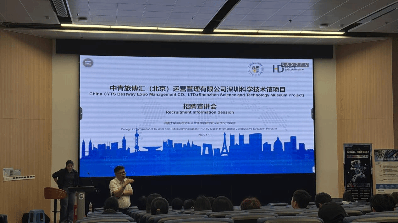 为深入贯彻落实国家关于深化产教融合、促进高校毕业生高质量就业的决策部署,充分发挥校企协同育人优势,助力培养具有国际视野与行业竞争力的高素质人才,海南大学国际旅游与公共管理学院中爱会展国际合作办学项目于12月9日在观澜湖校区3-A107报告厅成功举办中青旅博汇(深圳科技馆)专场招聘宣讲会。本次活动旨在搭建高层次校企对接平台,推动专业建设与产业需求精准契合,为学生拓展高端实习就业通道,提升学院在文旅与会展领域的专业影响力。